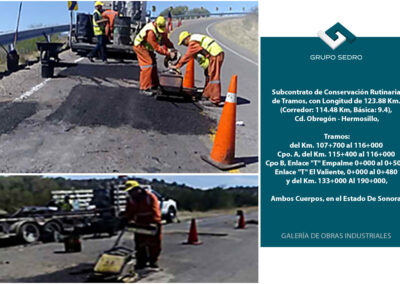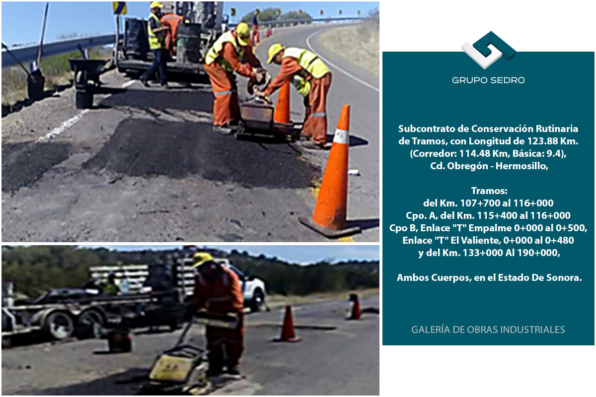 - Conservación rutinaria de tramos, con longitud de 123.88 km. (Corredor: 114.48 km, básica: 9.4), cd. Obregón-Hermosillo, tramos: del km. 107+700 al 116+000 cpo. A, del km. 115+400 al 116+000 cpo b, enlace «t» empalme 0+000 al 0+500, enlace «t» el valiente, 0+000 al 0+480 y del km. 133+000 al 190+000, ambos cuerpos, en el Estado de Sonora.